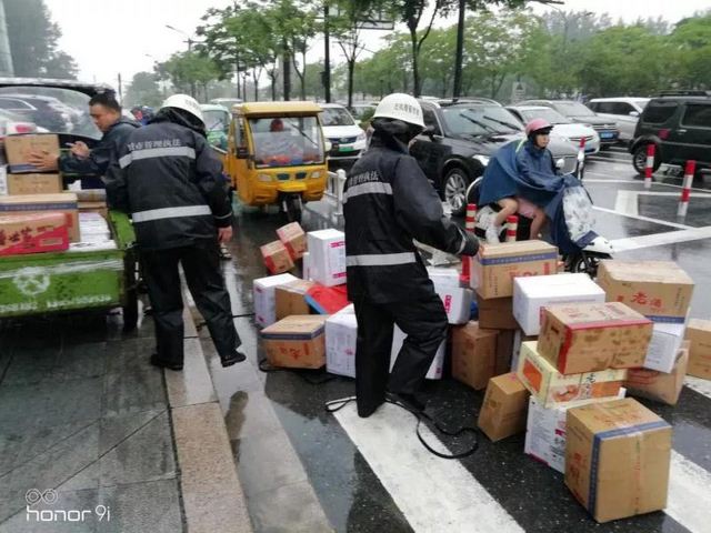 两名队员立即上前扶起司机,询问情况,所幸该司机并未受伤。华晨龙环视四周,发现该处正处于十字路口,车流密集,当时雨势又较大,如果不及时清理,将会存在极大的安全隐患。为防止二次事故的发生,他和许旭峰立即将货车暂停至路边,抓紧时间帮助司机将货物归位,直到所有货物装载完毕后目送司机离开,才又投入到了紧张的防汛巡查工作中去。