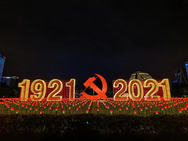 党徽位于中央,寓意中国人民在中国共产党的领导下同心同德、砥砺前行,不断创造新的人间奇迹。“1921”代表100年前中国共产党的创始,“2021”代表中国共产党团结带领中国人民实现第一个百年奋斗目标、开启第二个百年奋斗目标。布满的5200朵红色玫瑰灯,代表着对中国共产党的热爱之情。