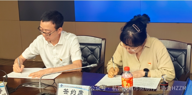会议上中共杭州市市容景观发展中心总支部委员会与中共杭州市路桥集团股份有限公司桥隧支部委员会、中共滨和环境建设集团有限公司支部委员会、中共浙江派威数字技术有限公司支部委员会、中共杭州西湖区市政工程有限公司支部委员会、中共杭州易融建设有限公司支部委员会、中共杭州久久建设工程有限公司支部委员会、中共杭州勇电照明有限公司支部委员会、中共杭州罗莱迪思科技股份有限公司支部委员会、中共横店集团得邦照明股份有限公司机关一支部委员会、中共浙江瑞林光环境集团有限公司支部委员会、浙江省机电设计研究院有限公司党委工程党支部、中共浙江大胜科技工程有限公司支部委员会、中共浙江大有实业有限公司杭州市路灯管理所分公司支部委员会、中共杭州大江东城市设施管养有限公司支部委员会、中共杭州瑞琦信息技术有限公司支部委员会、中共浙江九烁光电工程技术有限公司支部委员会、中共杭州康勋建设有限公司支部委员会共17家党支部签订党建结对共建协议。中共杭州市市容景观发展中心总支部委员会将更紧密的携手企业支部共同开展党建活动,发挥行业力量服务社会与百姓。