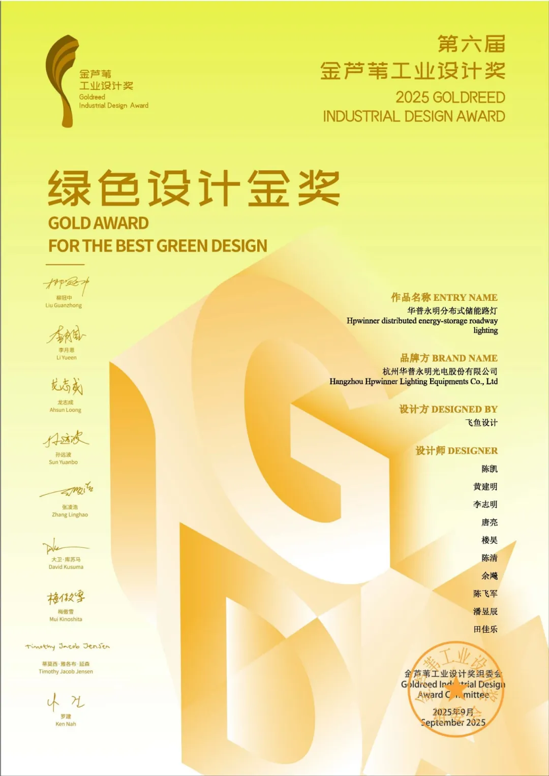 2025年,杭州华普永明光电股份有限公司捷报频传:公司核心产品LED储能路灯不仅接连斩获iF设计奖、红点设计奖、第六届金芦苇工业设计奖绿色设计金奖等多项国际顶级设计大奖,其自主研发的LED储能路灯技术更成功入选《轻工业重点领域节能降碳先进技术目录(2025 版)》,实现了国际设计认可与国家级技术认证的双重突破。