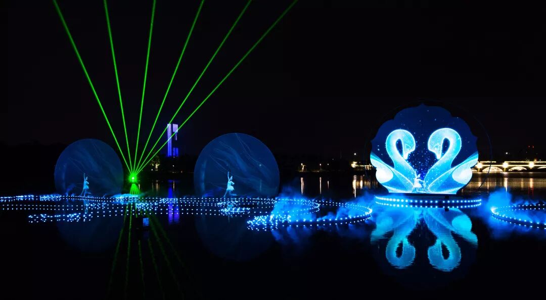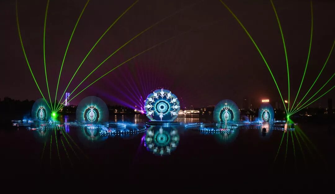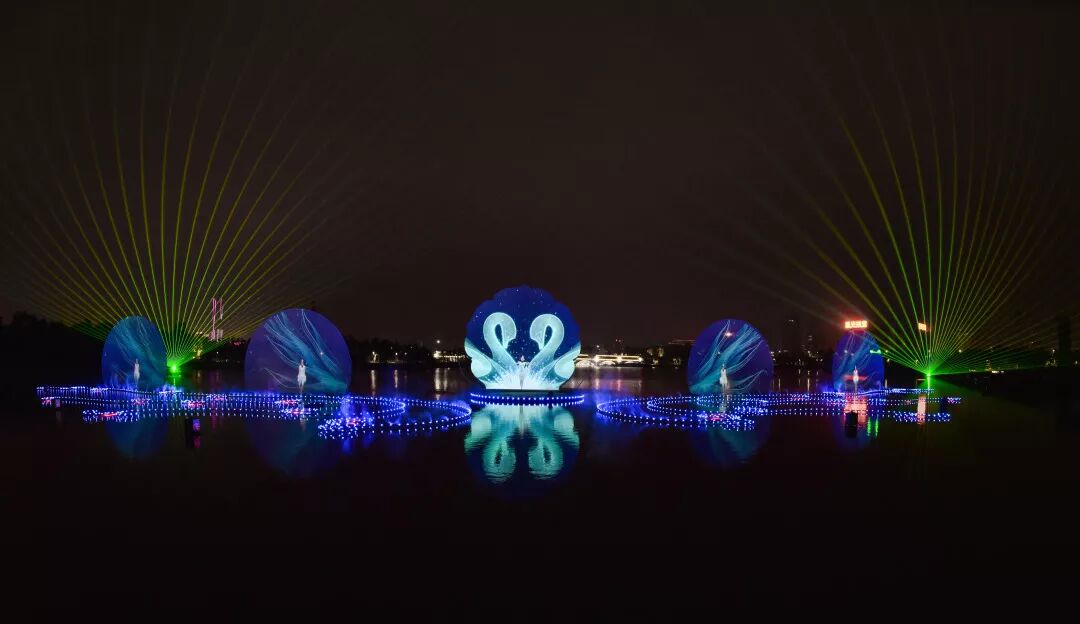 “北湖之光”应用3D全息投影,变化流动的灯光与喷火设备、雾效、音乐和互动舞蹈结合,通过智能控制系统展现出一幅湖光灯色的唯美画面!
