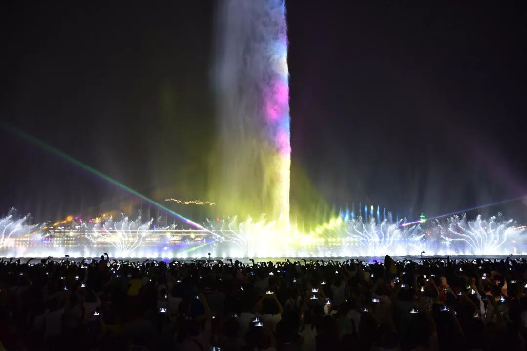 本届灯光文化节糅合更多的声、光、电元素对3D光幕喷泉进行重新编排,亚洲飞人从水幕中“冲刺”身姿矫健,五星红旗迎风高高飘扬,云龙飞舞,一百多米高的喷泉震撼夺目!看台上面人头攒动,观众们都拿出手机开启拍拍拍模式,只为留下这美好的一幕。