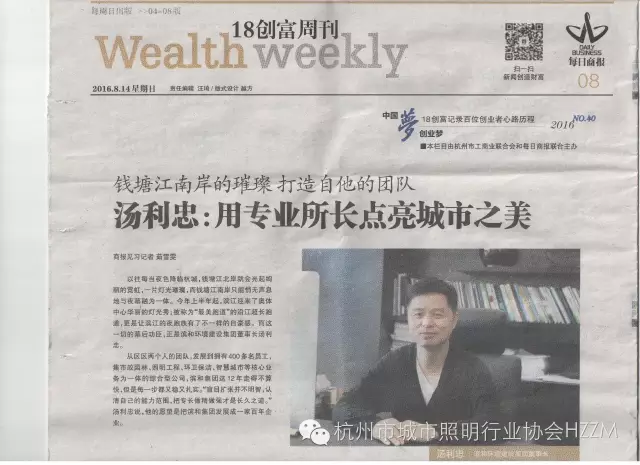 现实的磨砺使汤利忠积累起丰富的阅历,随着订单的不断累积,他对照明行业的了解也越来越深入。2004年,他与合伙人共同创建了滨和环境建设集团的前身——杭州珍信照明工程有限公司,开始承接一些小型照明工程。如今,滨和集团已经成为杭州照明市场的领军企业,获得的荣誉更是数不胜数。奥体中心工程拿下了业界知名的“阿拉丁神灯”优秀工程奖,正在进行的钱江四桥夜景照明工程也获得了第十一届中照照明工程一等奖。
