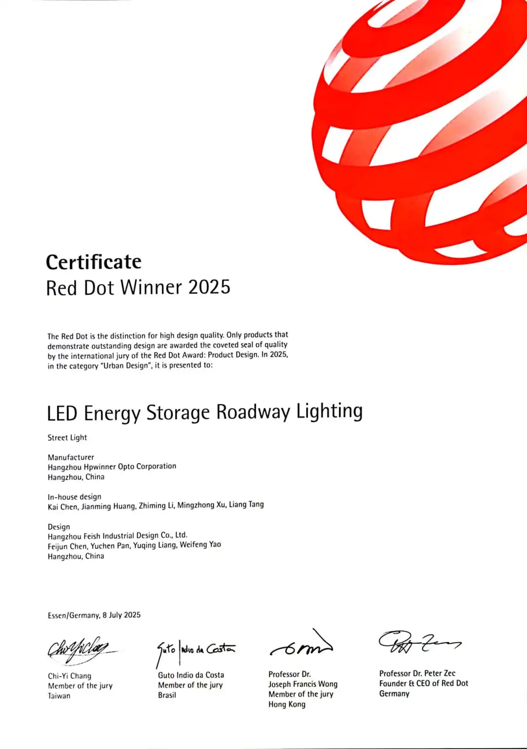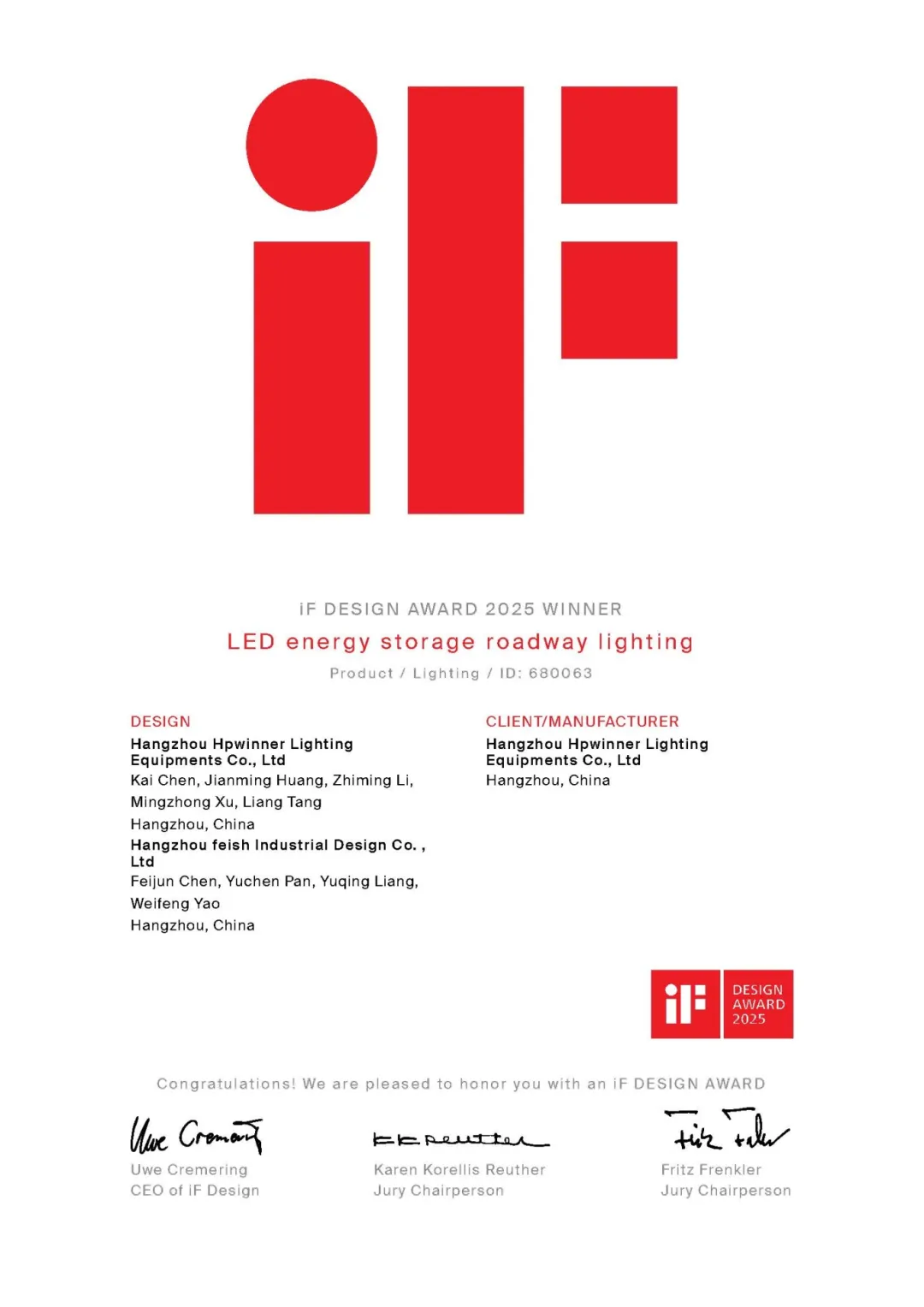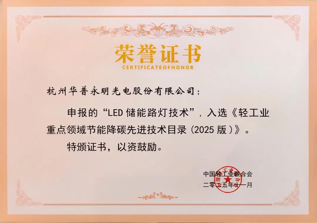 2025年,杭州华普永明光电股份有限公司捷报频传:公司核心产品LED储能路灯不仅接连斩获iF设计奖、红点设计奖、第六届金芦苇工业设计奖绿色设计金奖等多项国际顶级设计大奖,其自主研发的LED储能路灯技术更成功入选《轻工业重点领域节能降碳先进技术目录(2025 版)》,实现了国际设计认可与国家级技术认证的双重突破。