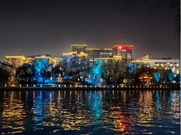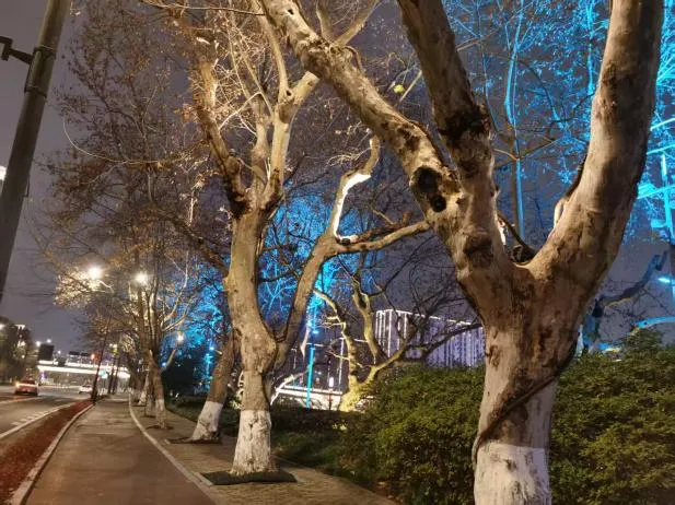 运河上街原有灯具光衰严重,此次安装洗墙灯111套、轮廓灯352套,建筑立面光影均匀;天阳D32街区照明设施几乎失效,养护单位全面更新管线、分控和灯具,亮灯轮廓错落呈现;丽水路照树灯集中改造,暖白光映照下树木层次分明、灯影婆娑,与运河夜景融为一体。