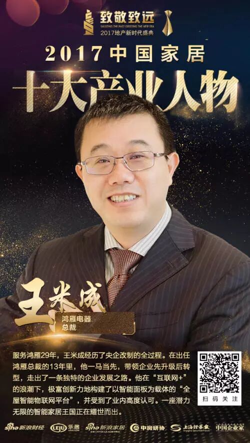2017年12月12日,由新浪财经、乐居、中房研协、上海证券报和中国企业家联合主办的“2017中国地产、家居、物业经理人”颁奖典礼在北京隆重举行。最终,杭州鸿雁电器有限公司总裁王米成脱颖而出,荣获2017中国家居十大产业人物。