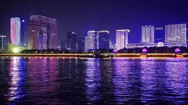 钱塘江两岸夜景亮灯非常壮观绚烂。从钱江一桥至三堡船闸之间的江水、堤岸、建筑、绿化在五光十色、变幻多姿的灯光中将描绘出一幅长逾10公里的“钱江夜曲”璀璨长卷。