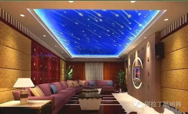 如图所示,天花板隔断处,就是LED灯带藏身的地方,暖白色的光,就是它发出来的,这就是“见光不见灯“!灯带一般装在暗槽中,可以让空间突显层次感,增加意境!